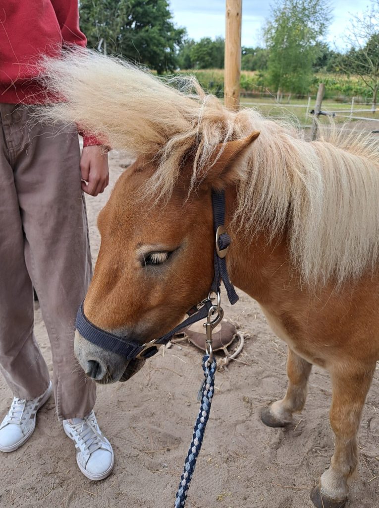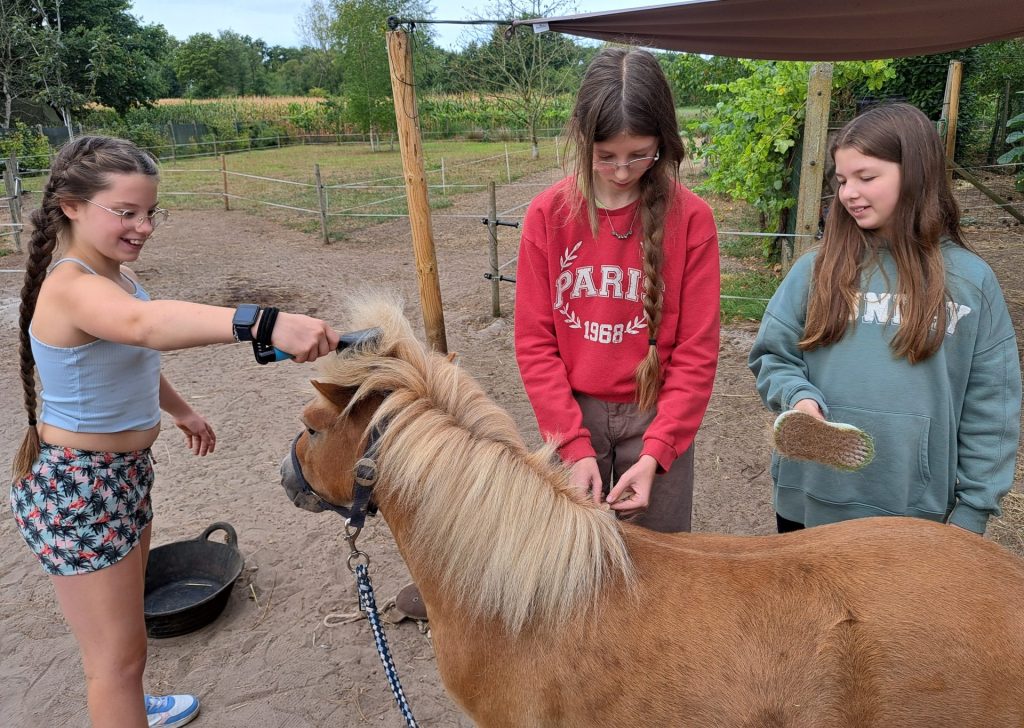 • Contact met pony’s, die feilloos spiegelen wat kinderen voelen (kijken en voelen bij de pony’s, borstelen, oefeningen, … met de voetjes op de grond)